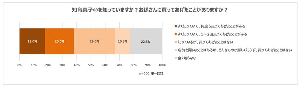 「ねるねるねるね」や「ポッピンクッキン」などの知育菓子®を知っているかを尋ねたところ、約7割(67.0%)が「知っている」と回答しました。孫に「買ってあげたことがある」と回答した人は約4割(38.0%)で、祖父母世代にとっても、知育菓子®はなじみのある存在として浸透していることがわかる結果となりました。