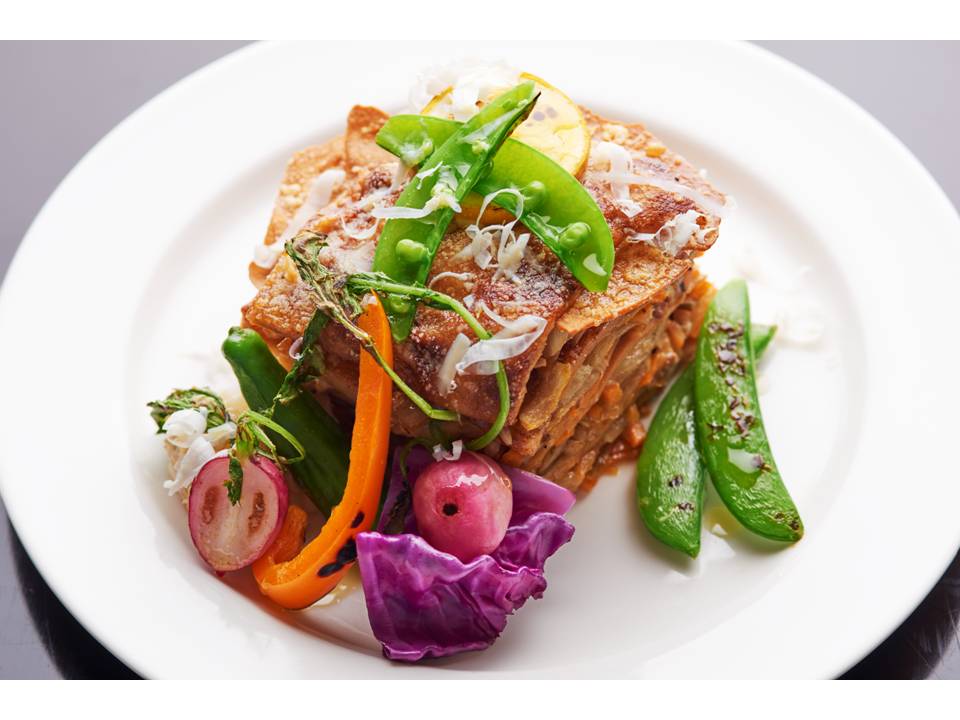 お店で一番人気のラザニアを今回は、きな粉を練り込んだパスタ生地や、チーズのような豆乳クリームを使用し、大豆づくしの優しい味に仕上げました。トッピングには、旬の野菜をふんだんに使用し、色鮮やかかつ、様々な野菜の味を楽しめます。カロリーが高いと思われがちなラザニアですが、大豆と野菜づくしでボリューミーなのにヘルシーに食べられる逸品となっています。