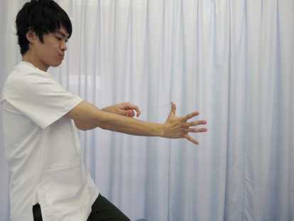3. もう一方の手で輪ゴムを持ち肘を伸ばして親指を身体側に引っ張ります。(輪ゴム飛ばしの要領)