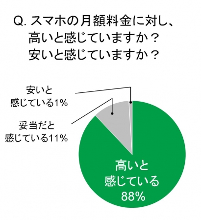 はじめに、スマホユーザーに「ご自身が1カ月にスマートフォン利用のために支払っている平均金額(1名分、端末代+データ通信費+通話料)」についてどう考えているのかをたずねたところ、スマホ月額料金が「高いと思う」と考えているユーザーは88%という結果になりました。