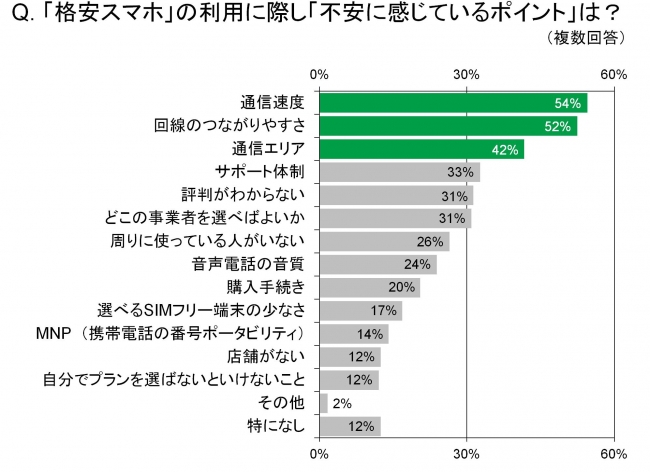 また、まだまだ利用率の低い「格安スマホ」に、不安を感じている人の多さも予想されます。「格安スマホ」の利用に際し「不安に感じているポイント」についてたずねてみると、1位は「通信速度」(54%)、2位は「回線のつながりやすさ」(52%)、3位は「通信エリア」(42%)が続き、大手キャリアの回線を使用しているMVNOであれば解消できるポイントにも関わらず、「不安」と考えてしまっている人が多く見受けられる結果になりました。