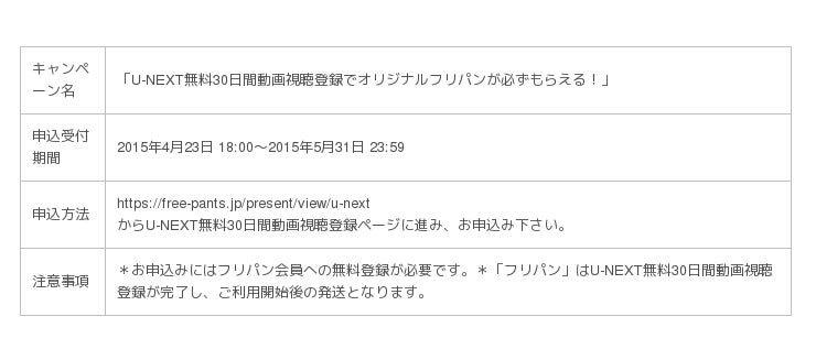 「日本で唯一のパンツ情報発信メディア」となる 「フリパン」(https://free-pants.jp)を運営する株式会社 ネクストポケット(本社 東京都新宿区 運営管理責任者松原嘉辰)、株式会社 U-NEXT(本社 東京都渋谷区、代表取締役社長宇野康秀)が運営する映像配信サービス U-NEXT(以下、「U-NEXT」 http://unext.jp)の2社は、平成27年4月23日(木)より、 「U-NEXT無料30日間動画視聴登録でオリジナルフリパンが必ずもらえる!」キャンペーン(※1)を開始いたしました。