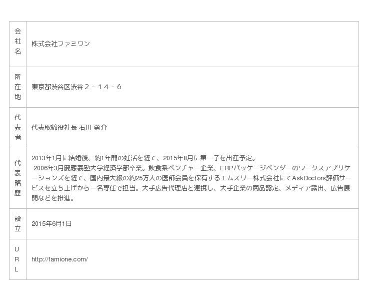 株式会社ファミワン(本社:東京都渋谷区、代表取締役社長:石川 勇介、以下当社)は、妊娠するための活動である“妊活”をサポートするためのサービス「famione(ファミワン、社名に同じ)」に対する一般会員の先行登録を開始します。7月の試験サービス、10月の正式スタートに関し、優先的に情報を提供します。