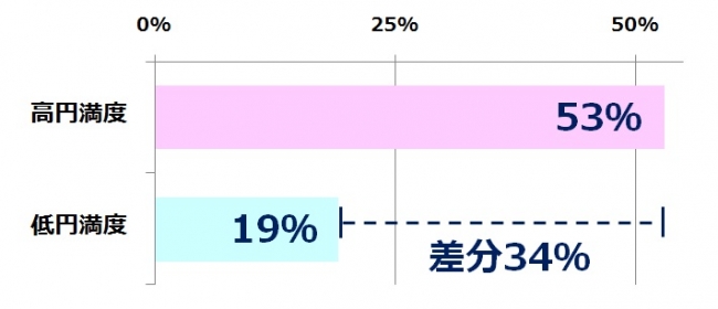 「高円満度」「低円満度」を比較すると、「お互いを尊敬すること」(差分 54%)、「毎日コミュニケーションをとること」(差分48%)、「お互いが変化することを好意的に受け止めていること」(差分34%)の順で大きく差が出る結果となりました。90点以上の高円満度を保ちつづける夫婦は、お互いの尊敬・コミュニケーションが密である傾向があるようです。