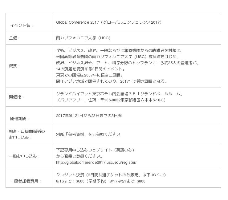 安倍晋三総理大臣の留学先として知られる米国の高等教育機関、南カリフォルニア大学(所在地:カリフォルニア州ロサンゼルス市、学長:C.L. マックス・ニキアス博士、以下「USC」)は本日、2017年9月21日から23日にかけて、東京都六本木のグランドハイアット東京ホテル内会議場「グランドボールルーム」において、「Global Conference 2017(グローバルコンフェレンス2017)」を開催することをお知らせします。