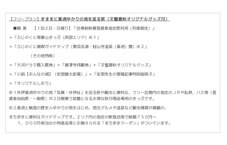 ・龍潭寺拝観券、文藝春秋社オリジナルグッズなどの特典付きプランとなります。