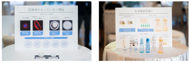 ほかにも、防腐剤による肌ストレスを解説している展示や、密封容器の刷新、新しい開封方法の紹介も。こちらには、歴代のスキンケアボトルもあり、現在のモデルに至るまでの歴史をまとめています。