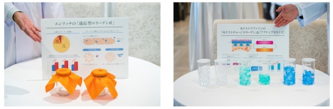続いて、ファンケルの新スキンケアのこだわりを体感できる研究力体験コーナーへ。ここでは、新スキンケアの「エンリッチ」・「モイストリファイン」の特長が伝わる実験や展示をおこなっています。「エンリッチ」の成分「適応型コラーゲンα」の浸透力の高さを実証した実験は、肌の組成に近いシルクの布を使用して行います。この布の上に、「エンリッチ」に使用されている「適応型コラーゲンα」と、一般的なコラーゲンを垂らして違いを比較します。すると、「適応型コラーゲンα」のほうは綺麗な丸い円を描きながら急激に広がっていき、どんどん浸透範囲が大きくなっていきます。これは肌馴染みがいいということを表しています。この実験で「適応型コラーゲンα」と一般的なコラーゲンの浸透の速さの違いをはっきりと目で確認することができます。(写真左)
