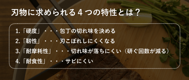 この4つのバランスを追求し生まれたのが、クロムモリブデンバナジウム鋼のナイフとフォークです。