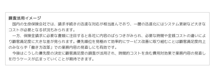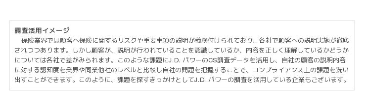 商品説明時に重要事項の説明が徹底されているか、顧客の理解を得ているか、ということは、特に金融機関において大変重要です。J.D. パワーのCS調査では、満足度だけでなく説明が十分であったか、分かりやすかったかといったことも調査しています。こういったデータから、課題解決に向けたアクションプランの策定を実施する企業が増加してきています。