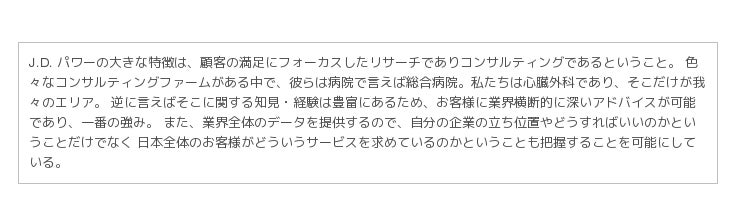 最近では日本でもトップマネージメントの役員報酬の決定方法において透明性や対外的な説明責任が強く意識されてきています。米国ではJ.D. パワーのシンジケート調査を経営幹部報酬の判断材料に活用する動きが多く見られています。