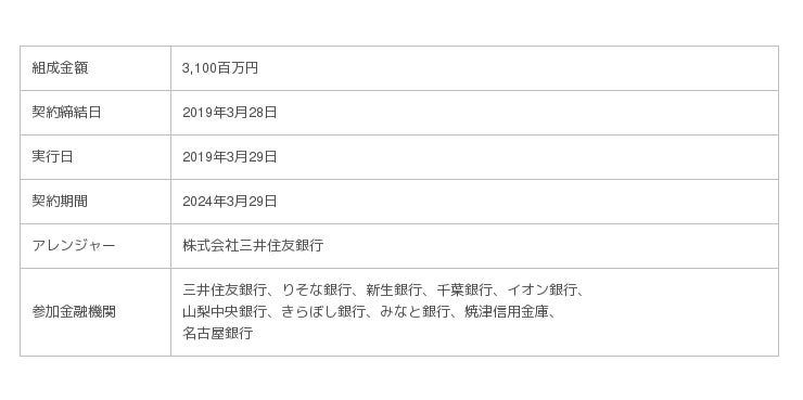 株式会社三井住友銀行をエージェントとし、2019年3月28日付で以下のとおりシンジケートローン契約を締結いたしましたのでお知らせします。