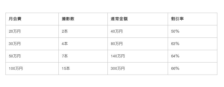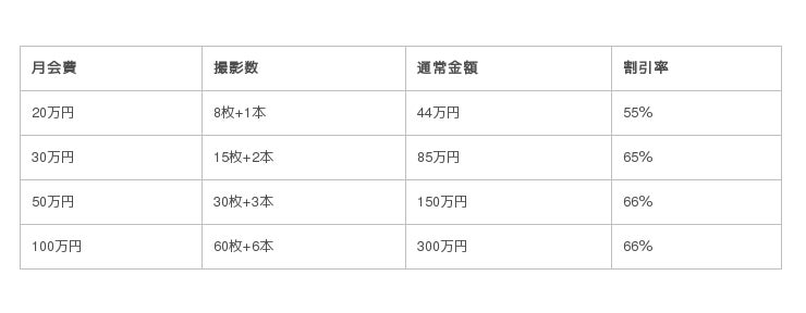 写真、動画、写真+動画、それぞれ年間契約でお得に撮影できます。