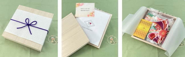 贈り物としての用途に、木箱と和紙で包んだプレゼント包装に対応しています。また、7種類のメッセージカードを選択して同梱できるサービスもあります。