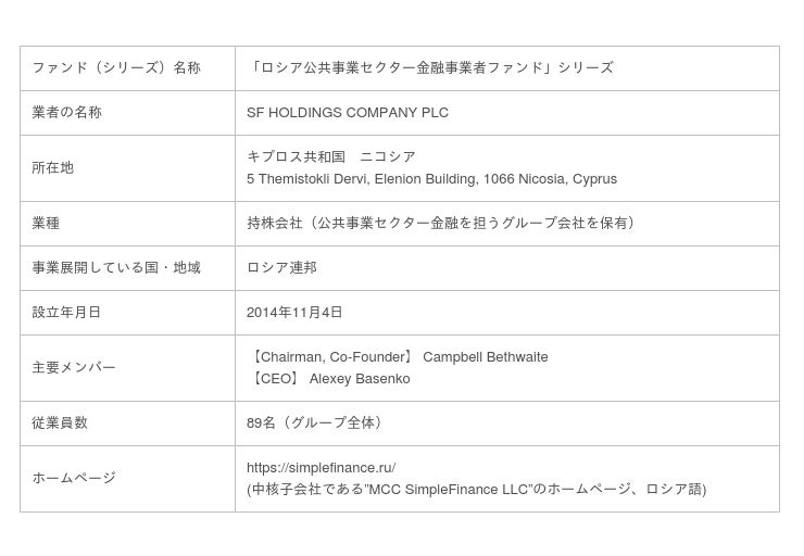 本ファンドの貸付先であるSF HOLDINGS COMPANY PLC(以下「SF Holdings社」といいます)は、2014年にキプロスで設立された金融持株会社で、傘下の事業運営会社を通じて、ロシア全土で中小企業向け貸付事業を行っています。