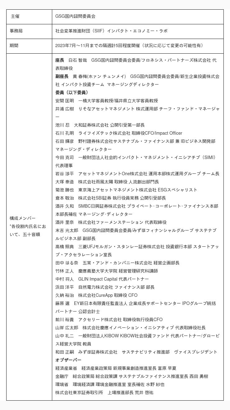 上場投資家等にも広くインパクト追及の意義を理解してもらう必要性があることから、同WGは、上場を目指すインパクト企業に加えて、インパクトに関心のある上場・未上場の投資家、証券会社、インパクト・ESG領域の有識者、証券取引所等の多様な委員・オブザーバーにより編成され、2023年7月〜11月までの計5回程度の開催する予定です。