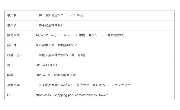 三井不動産は、2004年の「COREDO日本橋」の開業を皮切りに、「残しながら、蘇らせながら、創っていく」をコンセプトとした、官民地域一体となった「日本橋再生計画」を推進し、多様な人々で賑わう「人」主役の街づくりを目指してまいりました。そして2019年、「日本橋室町三井タワー」の竣工を経て、「日本橋再生計画」は第3ステージへと進み、「豊かな水辺の再生」「新たな産業の創造」「世界とつながる国際イベントの開催」の3つの重点構想を通した街づくりを進めています。2019年9月の「コレド室町テラス」開業に続き、「三井二号館」の1階部分のリニューアルが完了することで、「コレド室町テラス」の大屋根広場と一体となった開放的で賑わいのある空間、日銀通りの憩いと風格ある街並みが実現します。