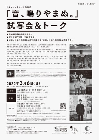 公益財団法人としま未来文化財団(所在地:東京都豊島区、理事長:高野之夫)は、豊島区指定無形民俗文化財「長崎獅子舞」「冨士元囃子」「雑司ヶ谷鬼子母神御会式万灯練供養」の現在を追ったドキュメンタリー映像作品『音、鳴りやまぬ。』を制作しました。2022年3月6日(日)に、としま区民センター多目的ホール(住所:豊島区東池袋1-20-10)にて試写会&トークを開催、本編を初公開します。