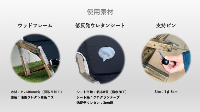 キャンプやグランピングで長時間座っていた後に、腰や背中に痛みや怠さを感じるというお話をよく伺いましたので、「クッション性が良く、座り心地の良い」ローチェアーにしたいというアイディアをカタチにしたシートです。