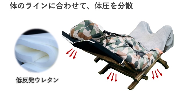 シートには「3cm厚の低反発ウレタン」を背もたれと座面の2箇所に使用しております。低反発ウレタンにより体のラインに沿って体圧を分散し、腰や背中・肩への負担を低減します。