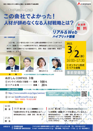 コロナ禍、コロナ後を生き抜くために必要な経営戦略のうちの「人材マネジメント(組織づくり)」の必要性を学びます。静岡鉄道の人材マネジメントの事例や、沼津で活躍する2社の経営者から、採用・育成・定着の事例、取組みを発信いたします。(参加費 無料)