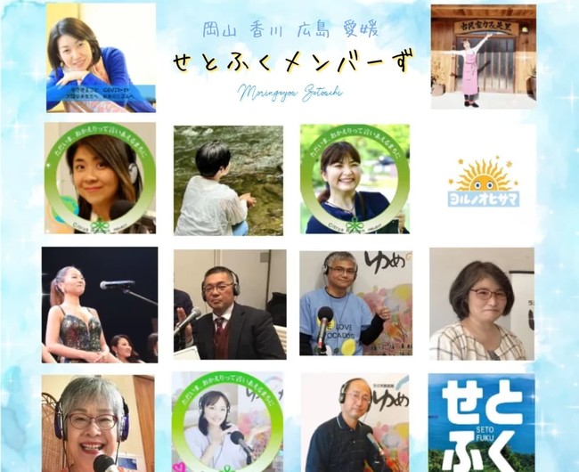 瀬戸内の魅力を伝えるためにインターネットラジオゆめのたね放送局のパーソナリティ有志で立ち上げた地域応援グループ。岡山・香川・広島・愛媛 在住のメンバーは 教師/主婦/農業/観光業など活動も世代も様々。講師 幸田リョウは全国9スタジオゆめのたね放送局のコミュニティ運営等のアドバイザーを務めている。