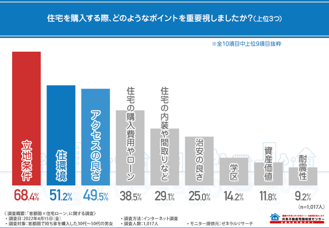 そこで、「住宅を購入する際、どのようなポイントを重要視しましたか?(上位3つ)」と質問したところ、『立地条件(68.4%)』と回答した方が最も多く、次いで『住環境(51.2%)』『アクセスの良さ(49.5%)』『住宅の購入費用やローン(38.5%)』『住宅の内装や間取りなど(29.1%)』『治安の良さ(25.0%)』『学区(14.2%)』『資産価値(11.8%)』『耐震性(9.2%)』と続きました。