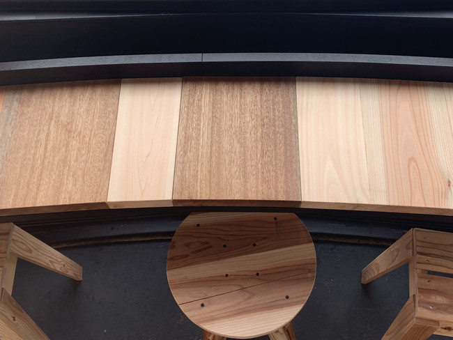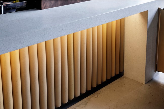 通常廃棄するダイノックシート(内装特殊シート)が巻かれていた芯を、カフェカウンター下の装飾としてアップサイクル。