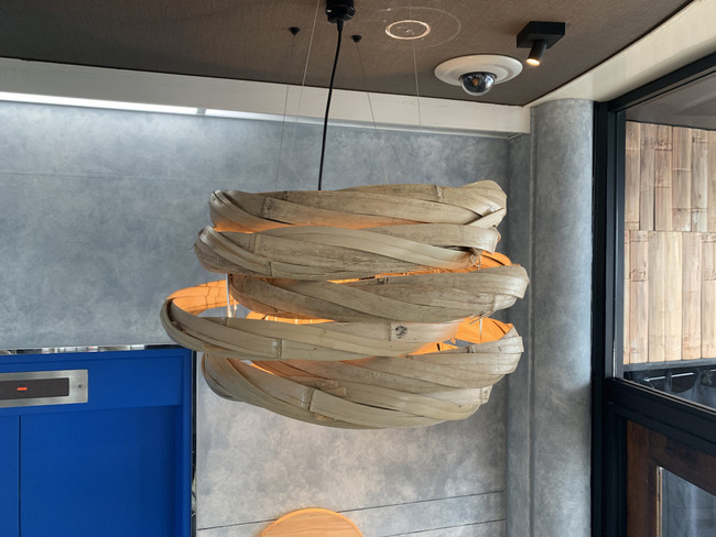 伐採された街路樹、六甲山の間伐材のヒノキや、神戸港で貨物の運搬の際にパレットとして使用されていた木材をカウンターテーブルの材料としてアップサイクル。実際に酒樽で使用していたタガをアップサイクルし、オリジナルシャンデリアを制作。