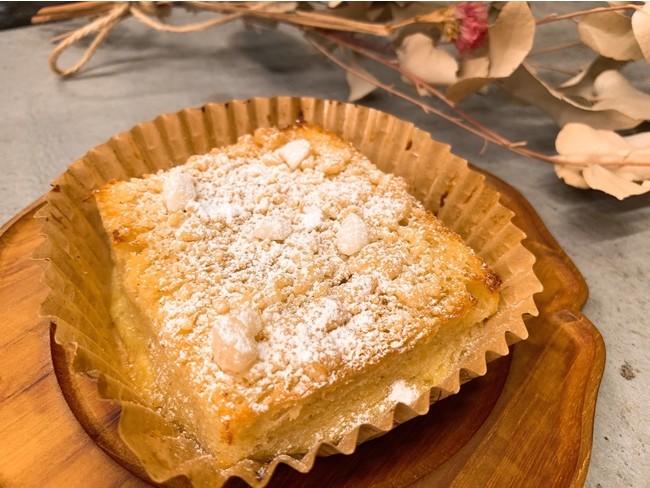 「風味豊かな卵液をしっかり染み込ませた生地に、アクセントとしてクランブルとあられ糖をのせてザクザクの食感を出しました♪」