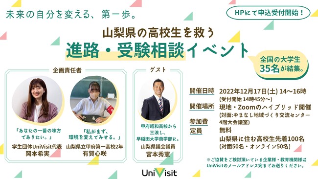 高校生の進路選択のサポートに取り組む、学生団体UniVisitは、この度、高校生の進路選択の支援の一環として「このままでいいの?山梨県の高校生を救う進路・受験相談イベント【1日限定】」を2022年12月17日(土)山梨県立やまなし地域づくり交流センター 4階 大会議室、Zoomにてハイブリッド開催いたします。