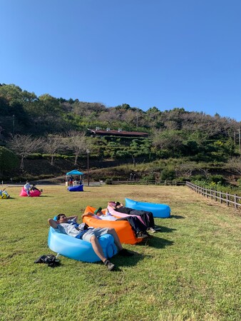 白石町にある自家焙煎珈琲goenの店主諸石紋子とコラボ企画としてD J音楽フェスを開催。この歌垣公園にD Jをお呼びしてのイベントは初であり、絶景の下エアーソファーに寝転びながら音楽を楽しみました。
