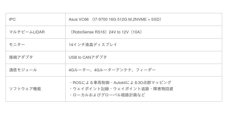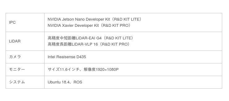 オープンソースフレームワーク「Autoware」をベースとした自律走行開発キット。自立的な障害物回避とパスプランニングが可能で、オープンソースソフトウェアによる豊富なアプリケーションがご利用いただけます。