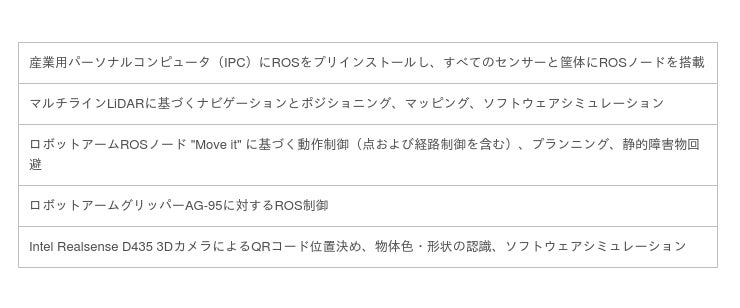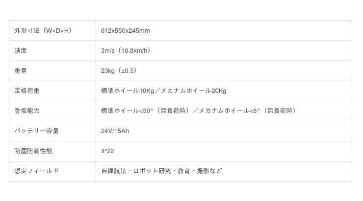 産業用ロボット開発のベースとなるオープンソースソフトウェア「ROS:Robot Operating System(ロボットオペレーティングシステム)」を採用し、幅広い開発環境に対応いたします。オフトロードホイール、メカナムホイール、クローラーが付属し、様々な走行状況への対応が可能となります。