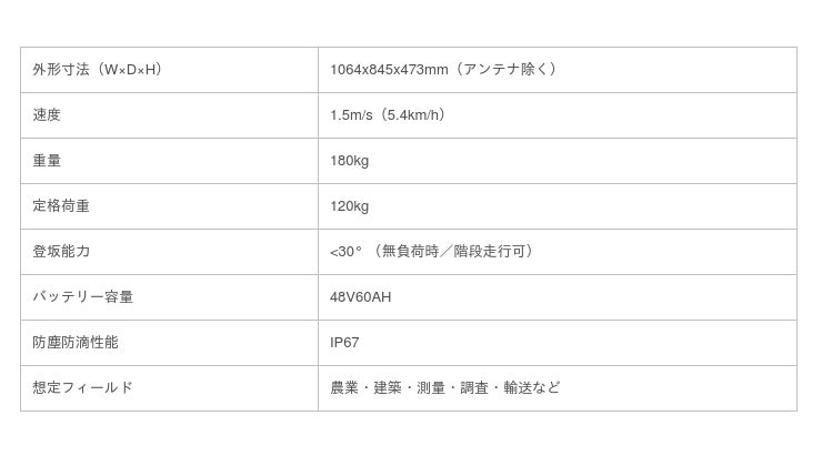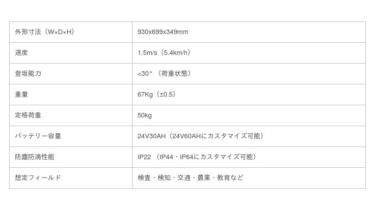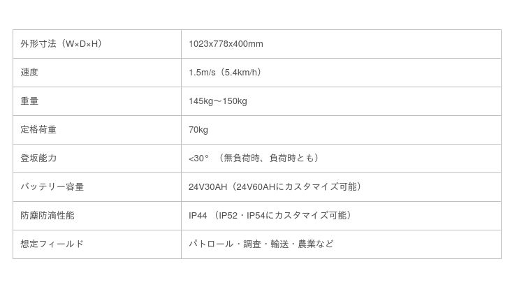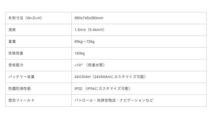 最大積載量が150kgで、交換式のバッテリーを採用することでタフな運用にも耐えうるプラットホームです。自律型の物流や配送用途に柔軟に対応いたします。