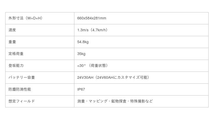 IP67の高い防塵・防水性能と、クローラー方式採用による走破性が特長のプラットホーム。最大積載量は120kg、最大登坂角度は30°と、農業や土木建築業など、過酷な状況においてもパフォーマンスを発揮いたします。