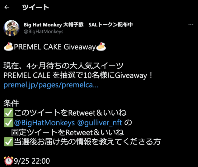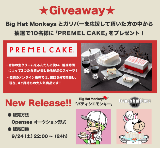 予約殺到の激レアスイーツ「PremelCake(プレメルケーキ)」がNFTで大注目のキャラとコラボ!【BigHatMonkeys】【Frenchbulldogs】Twitterでプレゼントキャンペーン