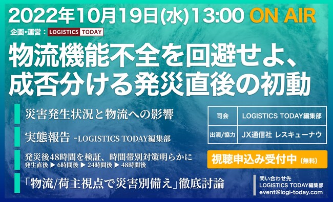 LOGISTICS TODAYは、オンラインイベント「物流機能不全を回避せよ、成否分ける発災直後の初動」を10月19日にライブで配信します。物流業界における喫緊の問題である「防災・BCP(事業継続計画)」を支援する先進的な取り組みに挑んでいる企業の担当者が登壇。現在の問題認識とその解決策、今後のあるべき姿について議論を繰り広げます。