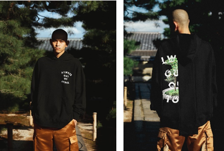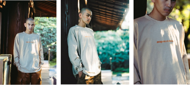 祇園辻利とのコラボレーションでは、ほうじ茶粉で染めと香り付けをしたロングスリーブTシャツを発売。イメージカラーのオレンジ色はこの季節のお茶でもある「壷切ほうじ茶」からインスパイアされたもの。また、POP UPの為に製作された枯山水をイメージしたグラフィックを落とし込んだクルーネックトレーナー、パーカーのバックプリントに枯山水を彷彿させる切り返しを入れたプルオーバーを限定で展開いたします。なお、12月4日(日)から京都のセレクトショップ「Elephants(エレファンツ)」にて販売予定です。