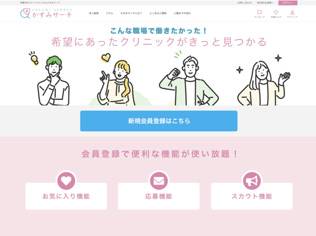 かすみサーチでは、ウェブサイト上で求人掲載〜スカウト、面談の日程調整まで完結するプラットフォームを提供します。