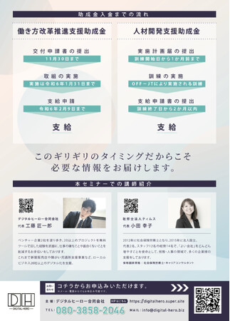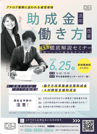 デジタルヒーロー合同会社(本社 : 大阪府、代表 : 工藤 匠一郎)は、2023年6月25日(日)に大阪府堺市にて、「【完全版】助成金活用*働き方改革 徹底解説セミナー ~無料ツールで進めるデジタル化~ 」を開催いたします。現代の無料ツールでできる業務の効率化(例えば月末の請求処理、給与計算など)のメソッドと、活用した支援事例を一挙公開。さらに、「社労士法人ティムス代表」小田幸子氏を講師に迎え、効率化支援サービスや社員教育に活用できる最新の助成金情報も合わせてお届けします。当日のお申し込みでもご参加頂けます。