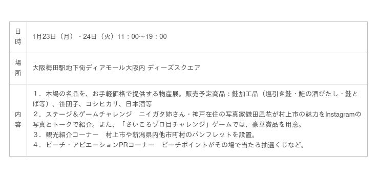 新潟県村上市イベント&グルメフェア「新潟県村上フェアin大阪」 ディーズスクエアと大阪市内5店舗で開催