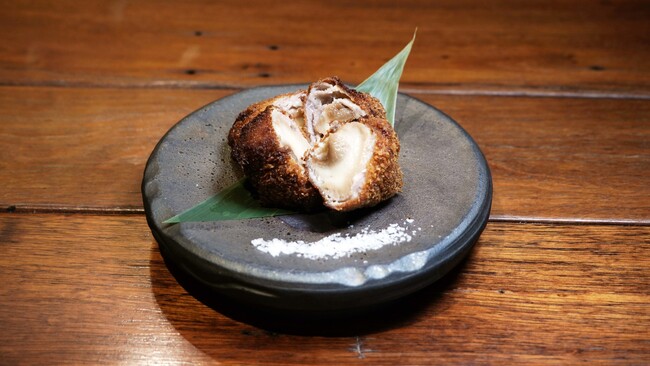 岩船麩の豚巻き出汁カツ(¥450 1日10食) 村上市特産の岩船麩にたっぷり出汁を染みこませ豚バラをまいたジューシーな贅沢カツ。他、大根と鮭のうま煮(突き出し¥400)や鮭の酒浸し(¥400)、村上市の日本酒・〆張鶴雪(90ml¥700)、越の松露(90ml¥500)。