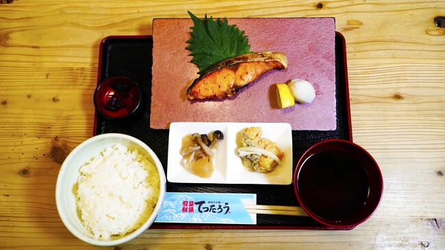 塩引き鮭定食(¥990) 新潟・村上市の風土が生んだ低温熟成の塩引き鮭の定食。溢れるうま味と程よい塩加減はご飯にぴったり。他、村上牛サーロインステーキ定食(¥1800)、ひもの定食(¥1100)、村上市の日本酒・〆張鶴 純(1合¥800)、日本国 吟醸(1合¥600)、村上茶アイス(煎茶、紅茶、ほうじ茶の三種、各¥500)等を予定。