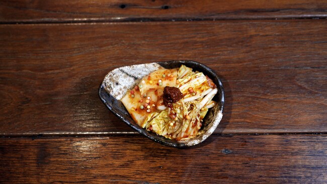 【エビスと共通】岩船麩の豚巻き出汁カツ、大根と鮭のうま煮(突き出し¥300)の他、村上市直送の新食感の生キムチ/村上白菜の生キムチ(¥300 1日10食)、村上山ぶどうチューハイ(¥590)。