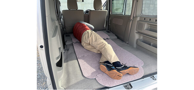 地震や台風、水害などの有事発生した時には、避難所が満員の場合もあります。そんな時には車などで寝泊まりする可能性も想定されますが、 そのような場合には、このように軽バンなどの後ろに設置することも可能です。