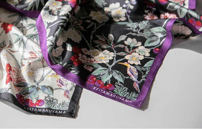 この素晴らしい日本の文化を次の世代へと残していくために、デザイナーの丸山敬太氏とコラボレーションをし、KEITA MARUYAMAのエッセンスが香るスカーフが誕生しました。