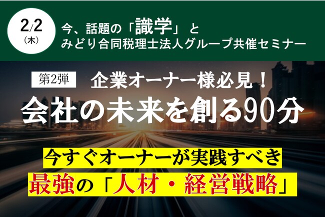 みどり合同税理士法人グループ・株式会社みどり未来パートナーズ(本社:香川県高松市、代表取締役会長:三好貴志男、代表取締役社長:澤田兼一郎、以下「みどり未来パートナーズ」)は、同グループ会社の株式会社みどり合同経営(本社:東京都新宿区、代表取締役会長:三好貴志男、代表取締役社長:澤田兼一郎、以下「みどり合同経営」)と、株式会社識学(本社:東京都品川区、代表:安藤 広大、以下「識学」)の3社共催で、企業オーナー向けに人材・経営戦略をテーマとしたセミナーを2023年2月2日(木)に開催いたします。