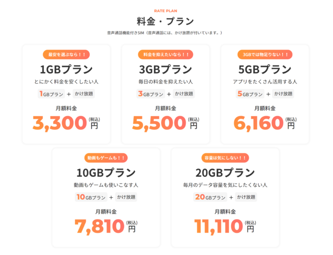 1GB+電話かけ放題プラン:3,300円(税込)