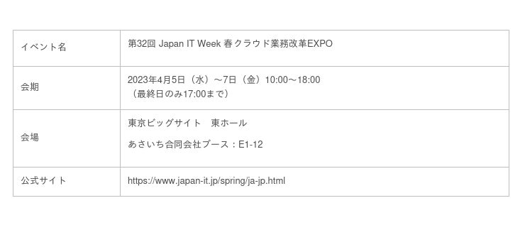 あさいち合同会社(本社:東京都中央区、代表社員:浅沼英理香)は、2023年4月5日(水)〜7日(金)に東京ビッグサイトにて開催される「第32回Japan IT Week春/クラウド業務改革EXPO」に出展します。